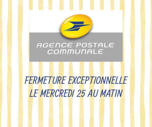 Fermeture exceptionnelle de votre agence postale communale demain matin en raison de la participation des agents à une réunion interne.